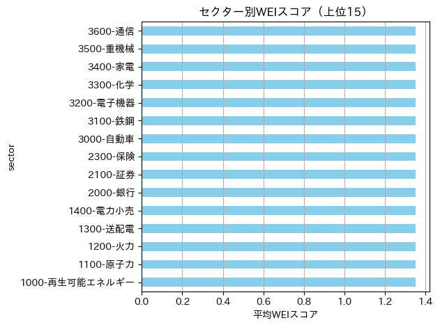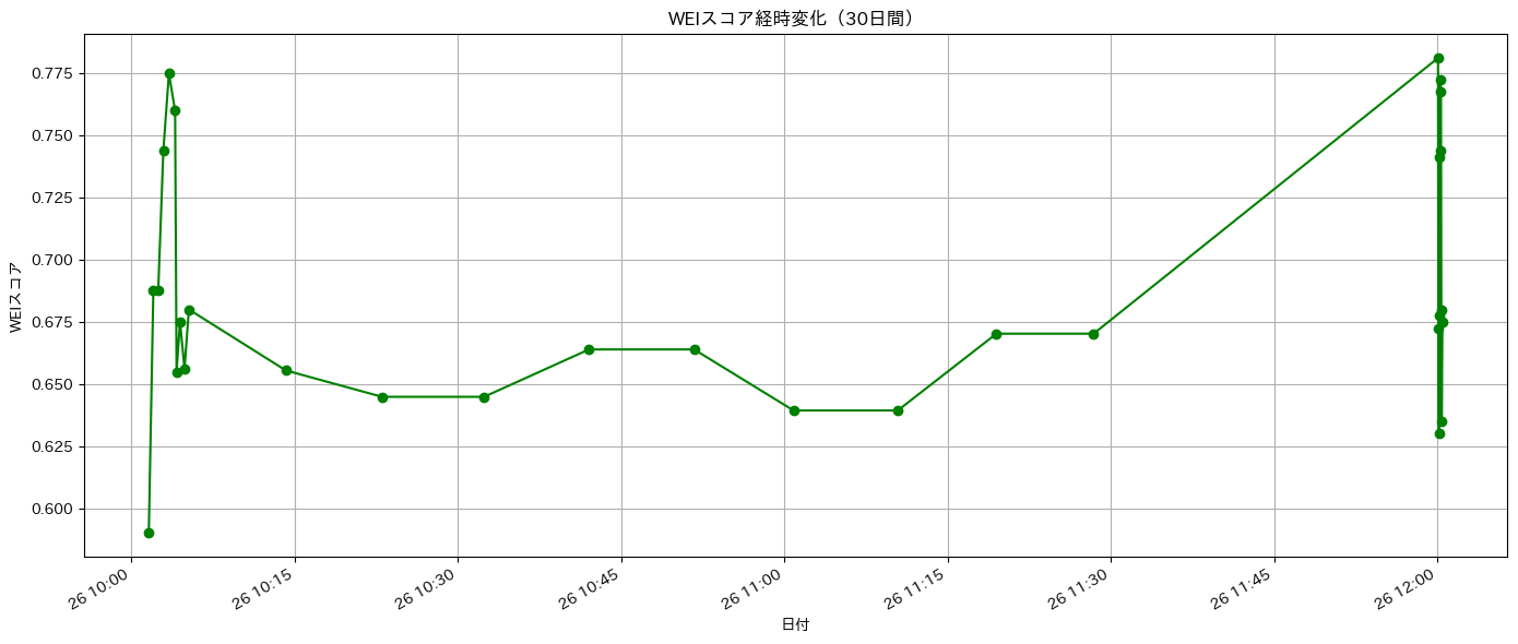 WEIスコアは業種ごとの注目度や成長性、また短期的な変化シグナルを可視化する指標です。しかし、今回全セクター(再生可能エネルギー、銀行、飲食等あらゆる業種)が同一スコアを示しており、市場全体に”静的均衡”が広がっている状況が読み取れます。このスコア分布は極めて稀であり、通常は業種ごとに需給バランスや外部材料によるばらつきが生じやすいですが、その兆候も全く見られません。